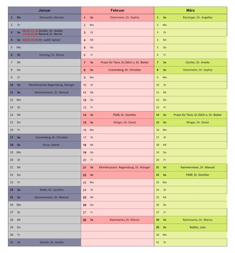 Bei kurzfristigen Änderungen (beispielsweise Krankenstand) kann der Notdienstplan abweichen. Wir bitten Sie, sich durch Abrufen der AB-Ansage Ihres Haustierarztes aktuell zu informieren.